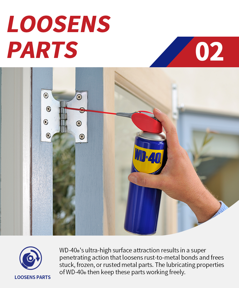 WD-40® Multi-Use Product lubricates moving parts such as hinges, wheels, rollers, chains and gears. It protects against rust and corrosion on items like tools and sporting equipment. It penetrates to free stuck corroded parts like nuts, bolts, valves and locks. It quickly removes adhesives, corrosion and paint. It displaces moisture to restore water flooded equipment such as engines, spark plugs and power tools.